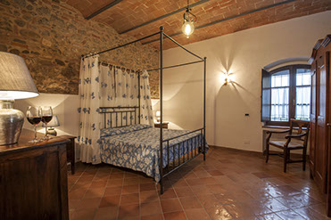 La camera, curata nei dettagli, ha un letto matrimoniale a baldacchino e un bagno interno con doccia.