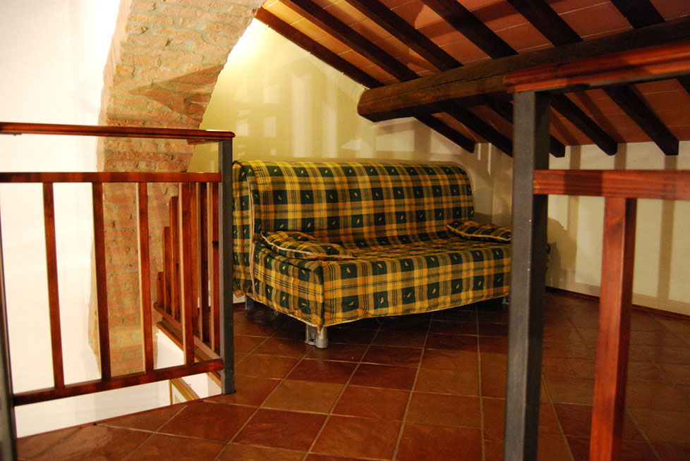 Una camera da letto matrimoniale con letto a baldacchino, una seconda camera da letto doppia, una terza camera doppia nella torretta (con scale a chioccola), un soppalco nel soggiorno con divano letto matrimoniale, due bagni con cabina doccia.