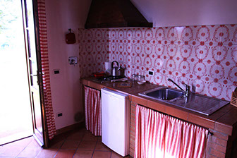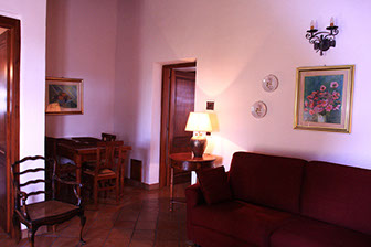 È composto da un grande soggiorno con zona pranzo e angolo cottura, divano letto doppio, camera matrimoniale con letto a baldacchino e porta finestra che apre sulla terrazza.
